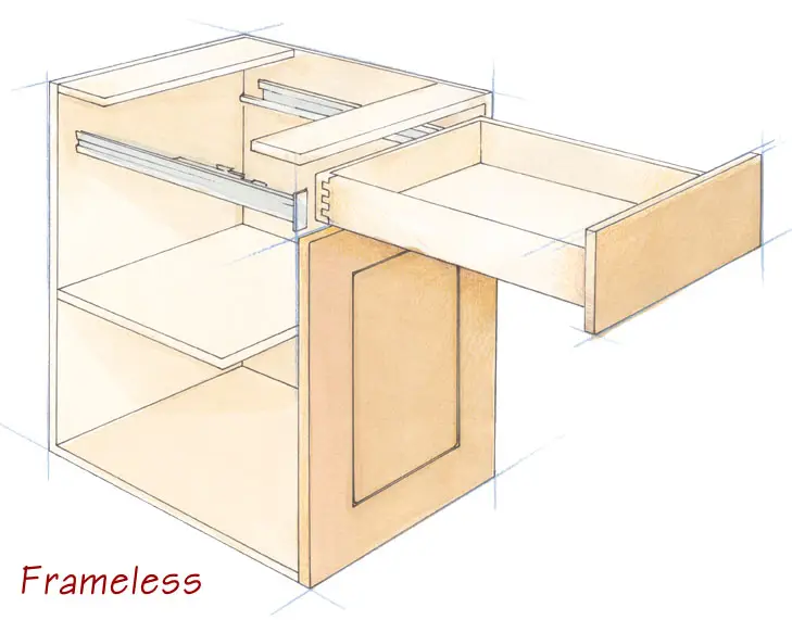 - Pros: If you are looking for a slick design, that’s the box to go with – when two cabinets installed together the reveal between the doors will be around 1/8″. Only 3/4″ thick sides will give you extra storage space in the drawer. Some accessories may not fit into framed cabinet of the same size as frameless.
